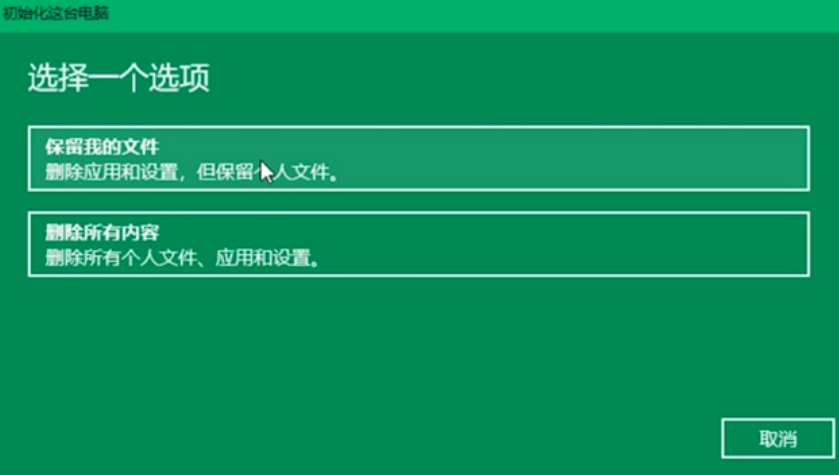 3、彈出初始化這臺電腦的窗口,根據自己需要選擇保留或者刪除文件,選擇后就可以等待系統執行完成一鍵重裝還原系統的操作了。