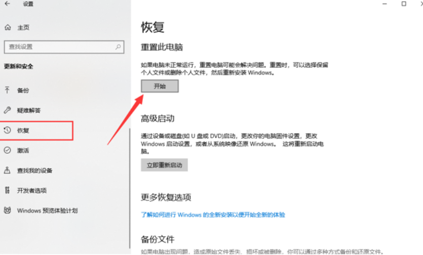 2、點擊左側欄的恢復,然后右側就可以看到重置此電腦選項,點擊開始即可進行恢復系統。