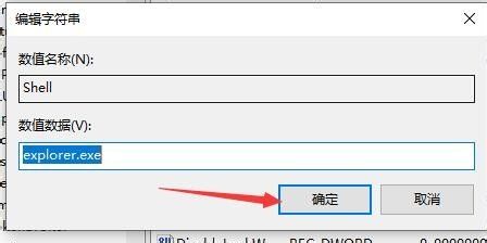 7、雙擊它,然后在彈出的窗口把數據修改為explorer.exe,點擊【確定】即可。注意下,記得輸入小寫。然后我們重啟計算機。