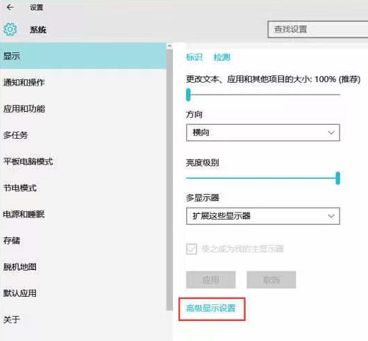 2.打開左欄目的顯示功能,拉到下方進入高級顯示設置。