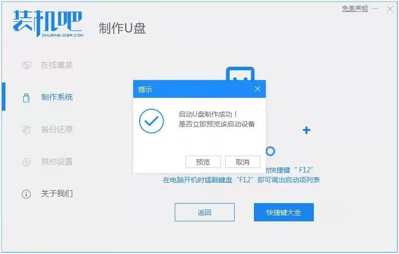 3、等待軟件自動制作u盤啟動盤,提示制作成功后先預覽需要安裝的電腦主板的啟動快捷鍵,然后拔出u盤退出。