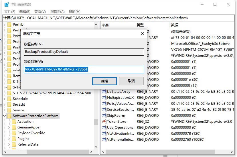 打開注冊表,依次展開:HKEY_LOCAL_MACHINE/SOFTWARE/Microsoft/Windows NT/CurrentVersion/SoftwareProtectionPlatform ,右側雙擊打開BackupProductKeyDefault,其數值數據就是激活密鑰。