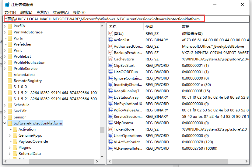 3、進入注冊表后,然后依次展開:HKEY_LOCAL_MACHINE/SOFTWARE/Microsoft/Windows NT/CurrentVersion/SoftwareProtectionPlatform ;