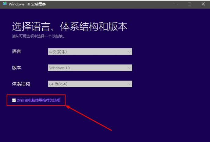 4.一般選擇「Windows10 64位」。如果你制作啟動盤和裝機的是同一臺電腦,直接勾選“對這臺電腦使用推薦的選項”就行。