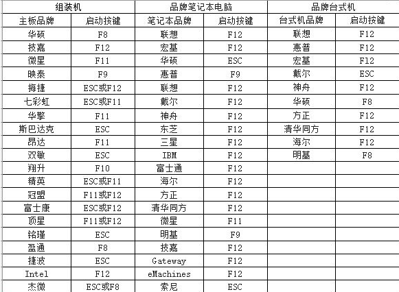 9.關閉電腦,插上U盤啟動盤,開機時按快捷啟動鍵,下圖為常見品牌電腦快捷鍵大全。