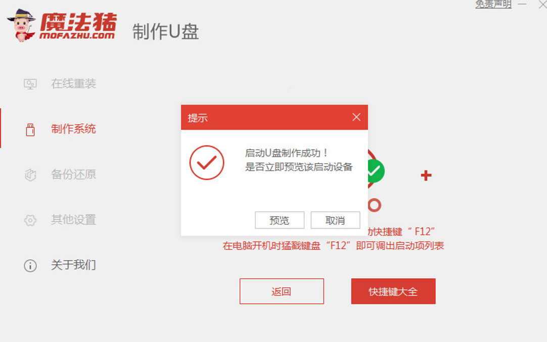 3、當制作u盤啟動盤成功后,我們可先預覽需要安裝的電腦主板的啟動熱鍵,然后再拔除u盤退出。