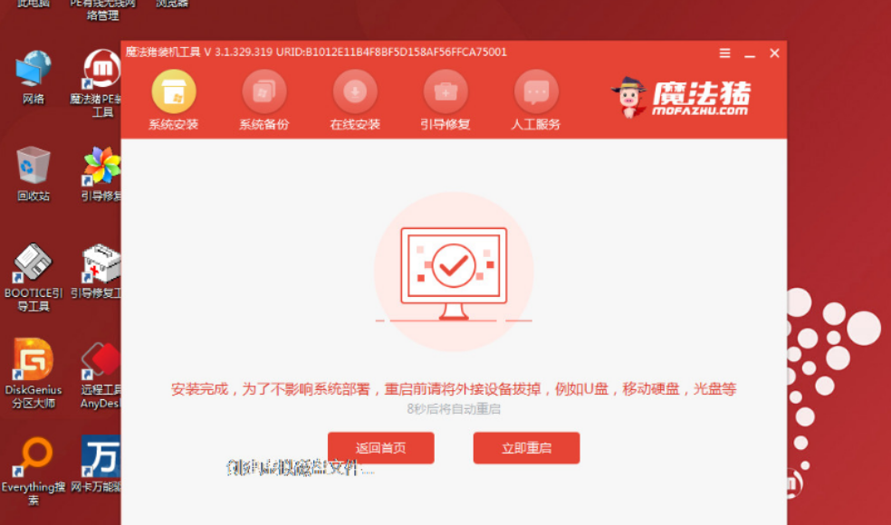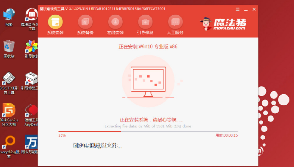 4、插入u盤啟動盤進電腦中,開機不斷按啟動熱鍵進啟動界面,選擇u盤啟動項回車確定進入到pe選擇界面,選擇第一項pe系統回車進入。然后在pe系統桌面上打開魔法豬裝機工具,然后選擇win10系統安裝到系統盤c盤上。