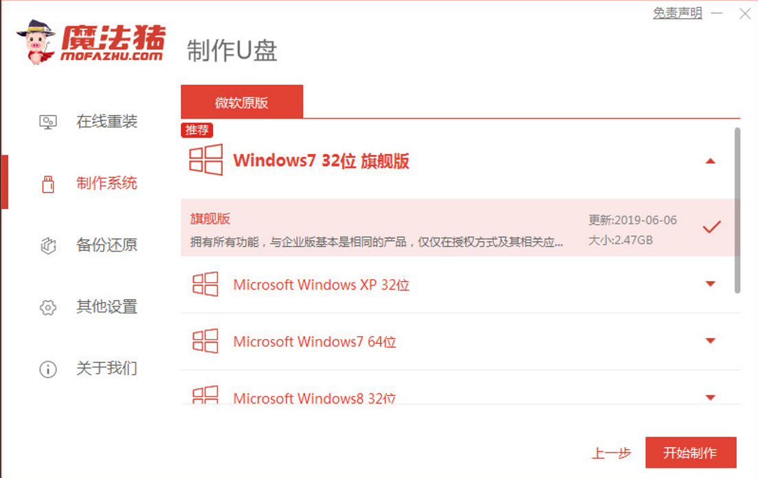 1、先在可用的電腦上下載安裝好魔法豬一鍵重裝系統工具并打開,插入u盤,選擇u盤重裝系統模式,點擊開始制作。