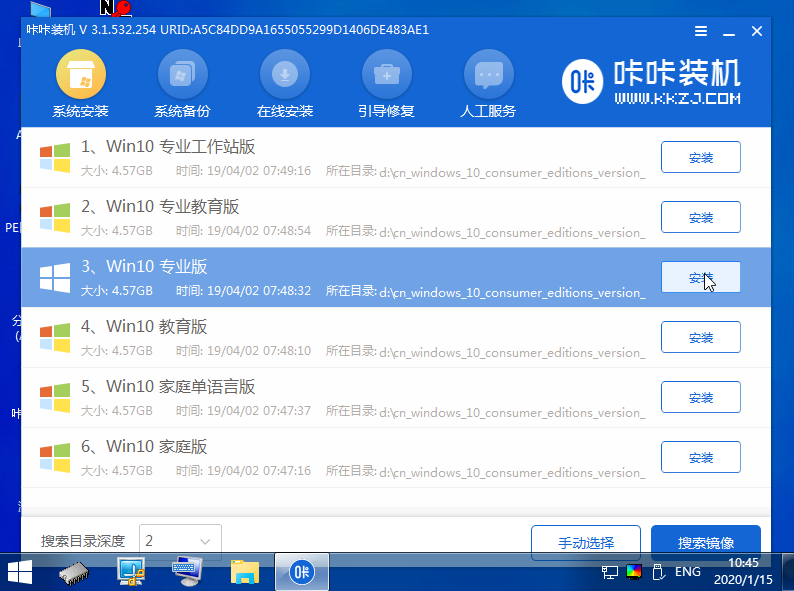 5、在pe系統桌面上,打開咔咔裝機工具選擇win10系統點擊安裝。