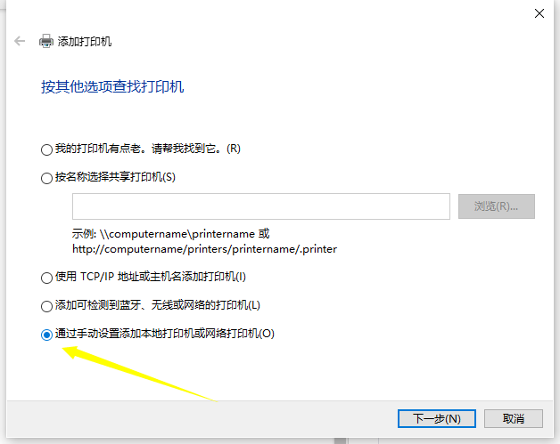 5、選擇“通過手動設置添加本地打印機或網絡打印機”,點擊“下一步”按鈕。