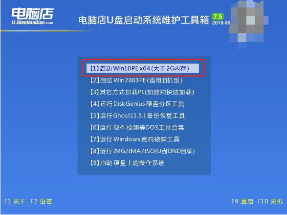 1、首先準備一個8G以上的U盤制作一個U盤啟動盤,關閉相應的殺毒軟件,然后將U盤啟動盤插入需要重裝的電腦上,出現開機啟動界面時不斷按下啟動熱鍵,選中U盤選項為第一啟動項,回車進入電腦店winpe 界面。
