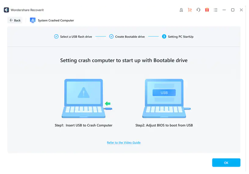 1、安裝萬興恢復專家后,啟動程序并從恢復選項“從崩潰計算機中恢復”模式,單擊下一個窗口上的“開始”按鈕。