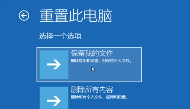 3、根據自己的情況,點擊“保留我的文件”或“刪除所有內容”(僅系統盤操作,不影響其他盤)。