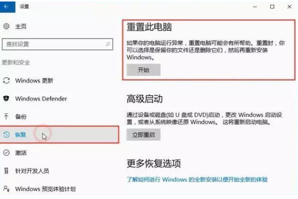 如果是還能進系統的情況下,那相關的還原windows10操作就更簡單了。直接打開win10系統設置-更新和安全-恢復-重置此電腦即可,接下來的過程就跟方法一類似了。