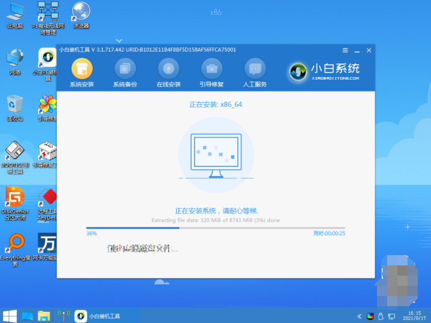 7、進入pe系統后,小白裝機工具自動開始安裝win10系統,安裝完成后重啟電腦。