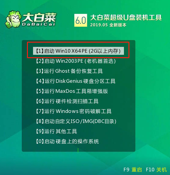 3、進入大白菜主菜單,選擇【1】Win10X64PE(2G以上內存)回車進入pe桌面,打開大白菜一鍵裝機軟件。