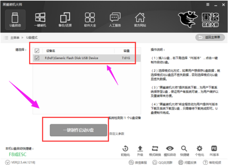 2、點擊右下角的PE版本,選擇要制作的PE系統。建議高級版。然后選中U盤,點擊“一鍵制作啟動U盤”。