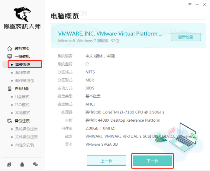 2、打開黑鯊軟件,選擇“重裝系統”,待檢測后進行“下一步”操作。
