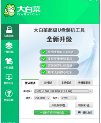 1、首先自行在電腦上下載大白菜U盤重裝系統工具打開,插入空白U盤進電腦。