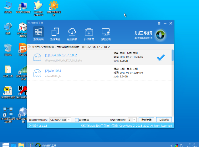步驟四:計算機進入小白PE桌面后會自動彈出PE裝機工具,勾選我們自己需要安裝的系統鏡像,左下角選擇“目標分區”,通常默認。