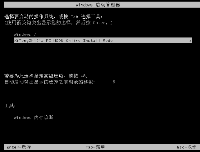 4、電腦重啟之后進入了開機選項頁面,選擇第二項xiaobai-pe系統進入。