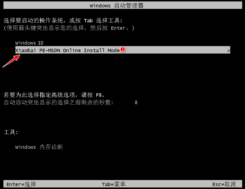 5、重啟系統后,來到啟動管理器界面選擇xiaobai-pe系統進入。