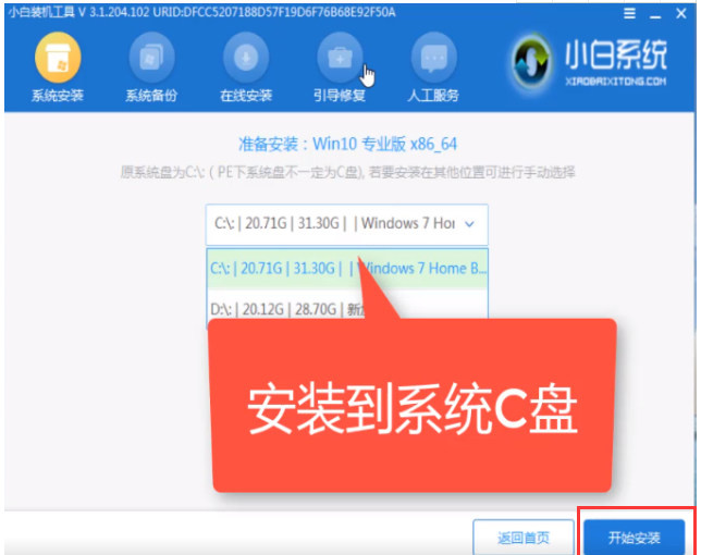 7、我們選擇需要安裝的位置,選好之后單擊【開始安裝】。耐心等待系統安裝完成,將拔出U盤,重啟電腦操作。