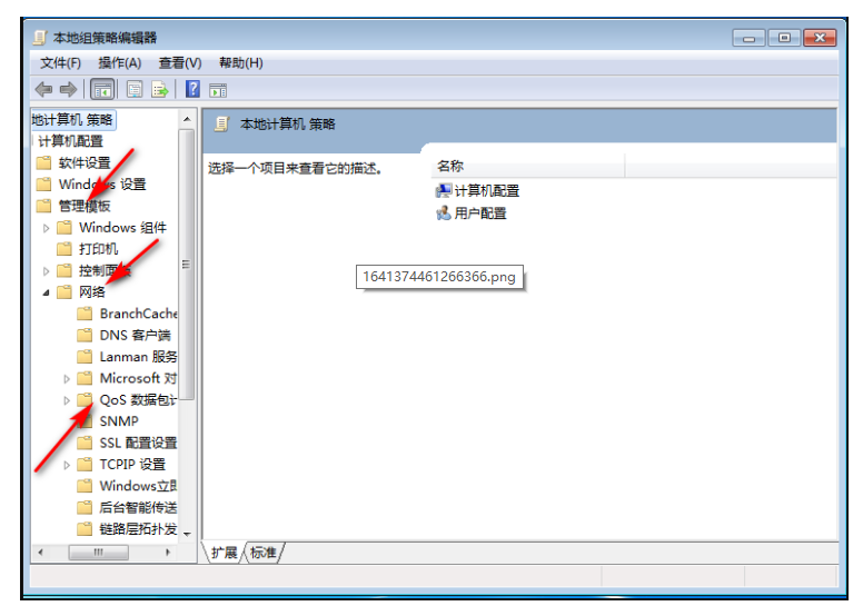 5、點擊管理模板,展開網絡,點擊進入Qos數據包計劃程序。