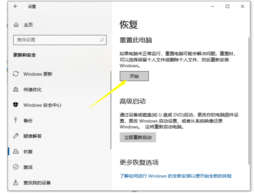 2、找到“恢復”,點擊右邊的“重置此電腦”,再點擊“開始”進入到還原出廠設置的過程,根據提示完成操作。