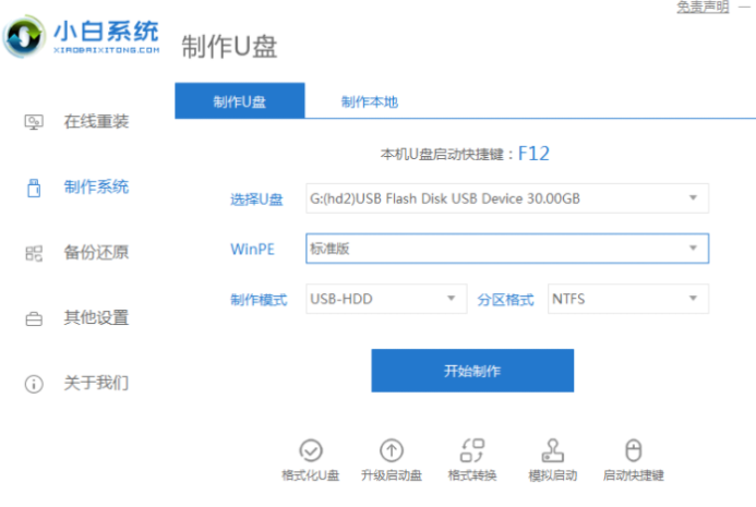 1.下載安裝小白一鍵重新裝入系統工具,選擇制作系統,選擇我們的U盤即可。