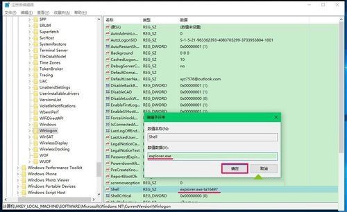 5、在Winlogon對應的右側窗口,找到Shell,左鍵雙擊Shell,如果Shell的數值數據為:explorer.exe,則是正確的,如果不是explorer.exe,則把Shell的數值數據更改為:explorer.exe(如還有其它字符,請刪除),再點擊:確定;