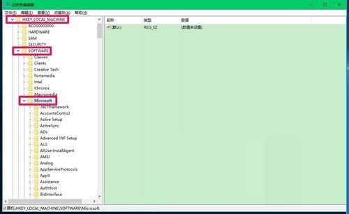 2、在打開的注冊表編輯器窗口,依次展開:HKEY_Local_MACHINE\Software\Microsoft;