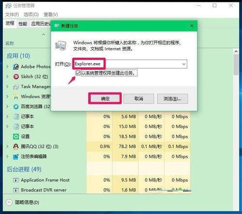 2、在打開的任務管理器窗口,點擊【文件】,在下拉菜單中點擊【運行新任務(N)】,輸入:Explorer.exe,點擊【以系統管理權限創建此任務】打勾,再點擊:確定,此時系統桌面圖標應該已經恢復。