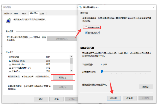 2、在系統屬性界面中,點擊“配置”,然后點擊“啟用系統保護”,再點擊”確定“。