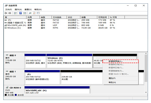 4、在這款區域上右鍵并選擇“新建簡單卷”,然后按照說明點擊下一步;