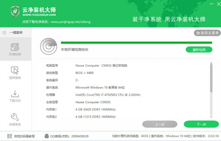 1、下載軟件完軟件后正常打開"云凈裝機大師",檢測完系統環境后,點擊"下一步"。