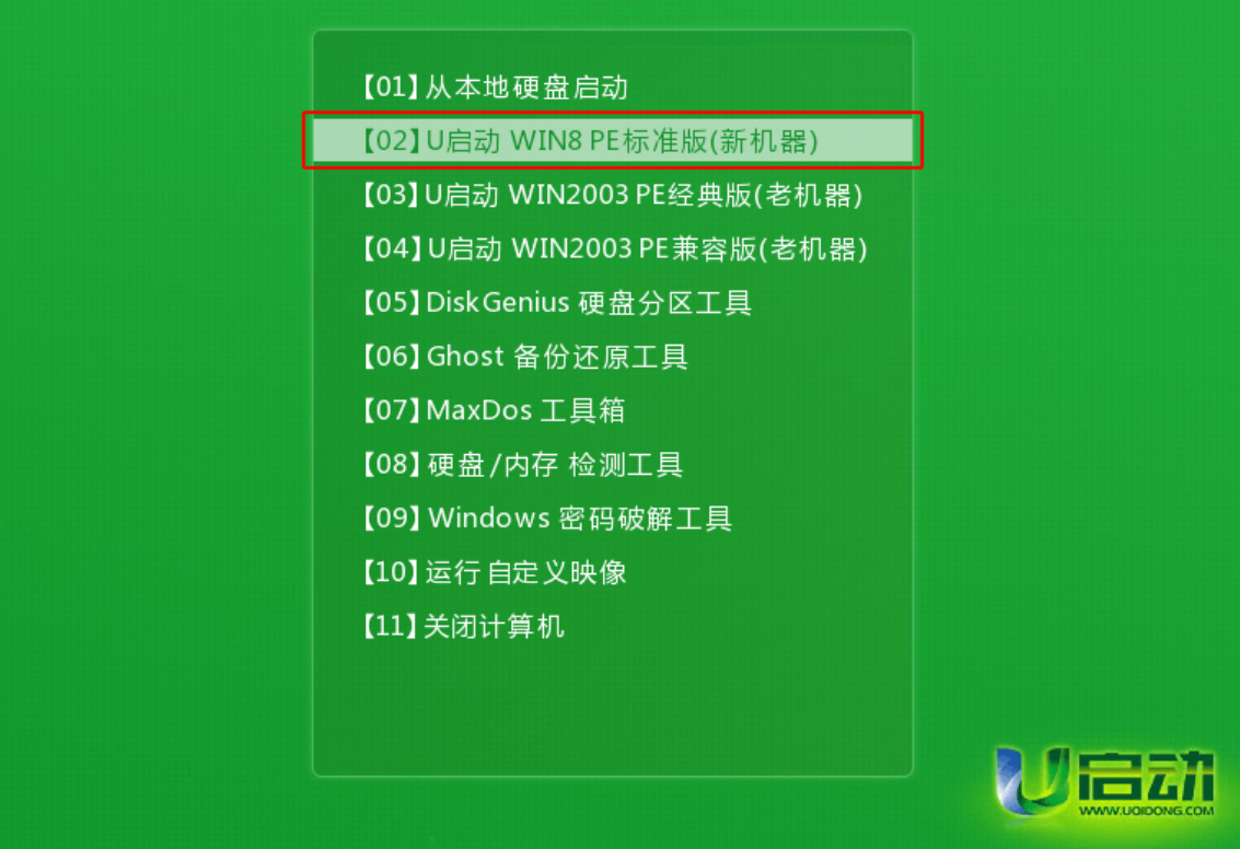 1、將制作好的u啟動啟動u盤插入電腦USB插口,在u啟動主菜單頁面,接著移動光標選擇“【02】u啟動WIN8 PE標準版(新機器)”。