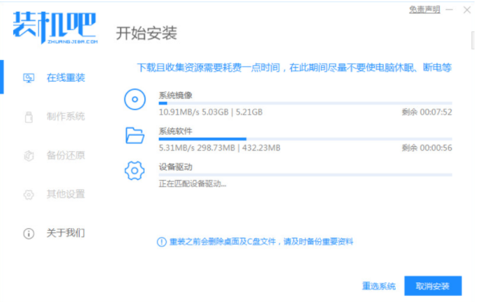 1.下載安裝裝機吧在線系統重裝工具,選擇win10系統進行安裝。