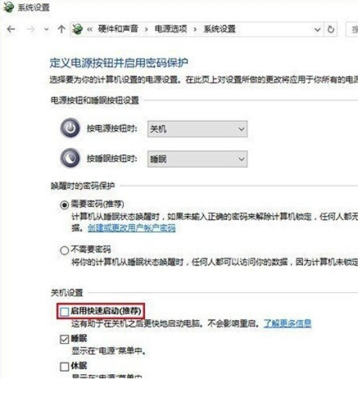 5.然后在“關機設置”下找到“啟用快速入門(推薦)”,刪除該選項前面的復選標記,然后單擊“保存更改”。