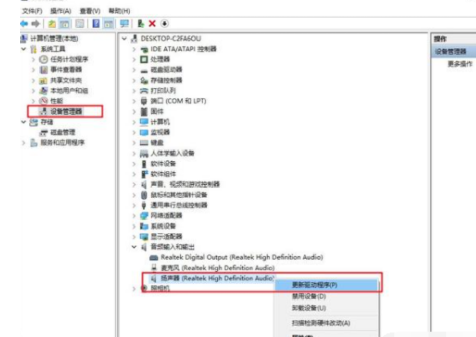 2、點擊設備管理器進入后,展開音頻輸入和輸出選項,鼠標右鍵對應的聲卡硬件設備并選擇更新驅動程序。