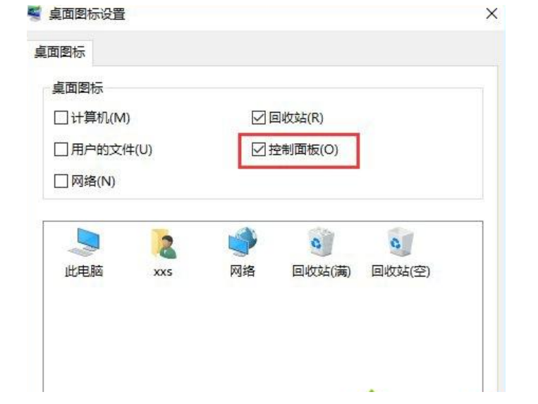 3、這時會進入“桌面圖標設置”窗口,在這里選中“控制面板”前的框,點擊確定即可。