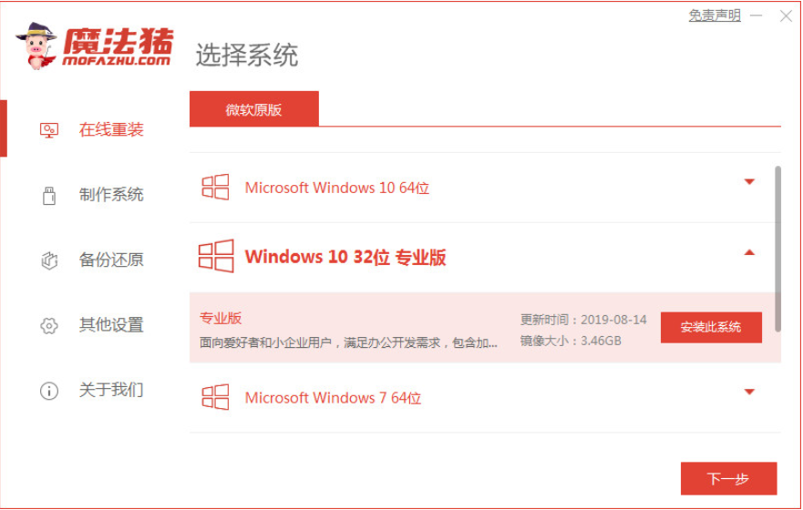 1.下載并打開魔法豬系統重裝大師軟件,點擊在線重裝,選擇合適的win10系統版本。