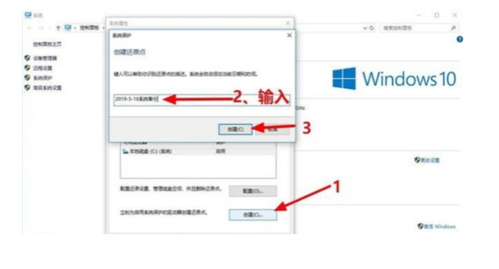3、然后點擊“創建”,輸入還原點描述后,點擊“創建”。