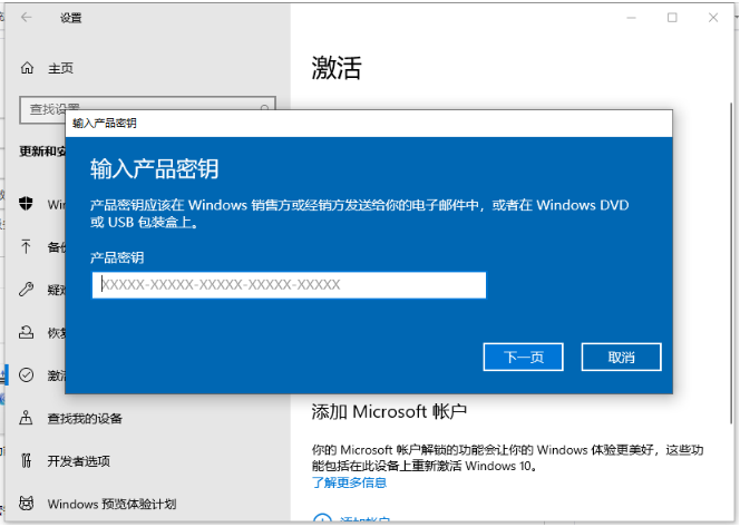 2、如果有其他渠道的激活windows10產品激活密鑰,只需要依次點擊電腦系統的開始菜單—設置—更新和安全—激活—更改產品密鑰,輸入密鑰,下一步,等待系統激活成功即可。