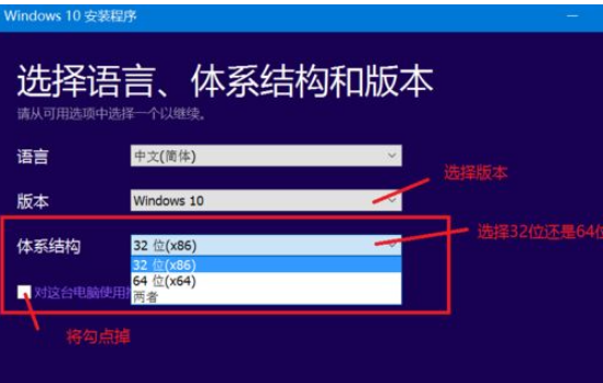 3.選擇相應的語言、系統版本和體系結構,下面的方框把打鉤“√”去掉,然后再點擊下一步。