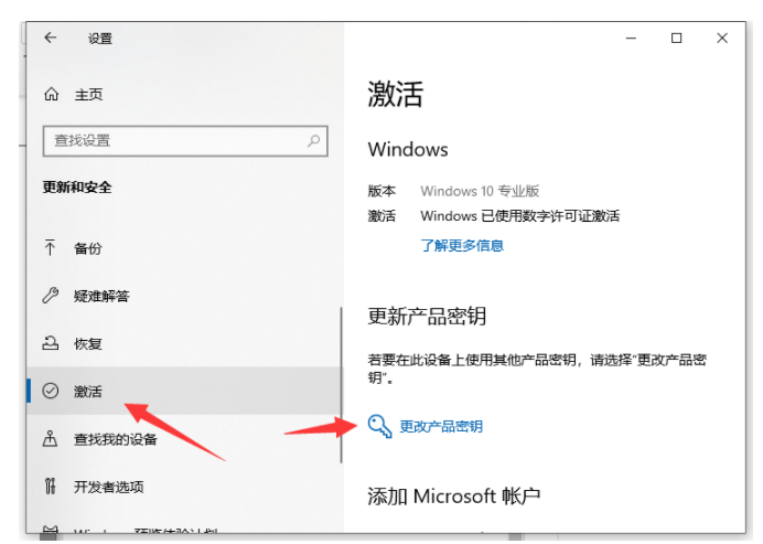 3、選中左側的激活,再點擊右側的更改產品密鑰。