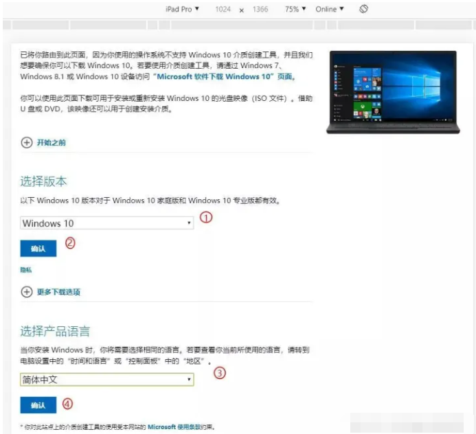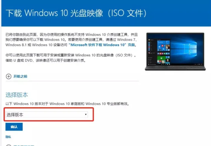 5、刷新頁面后,即可看到微軟官網界面發生變化,我們選擇版本下拉框。