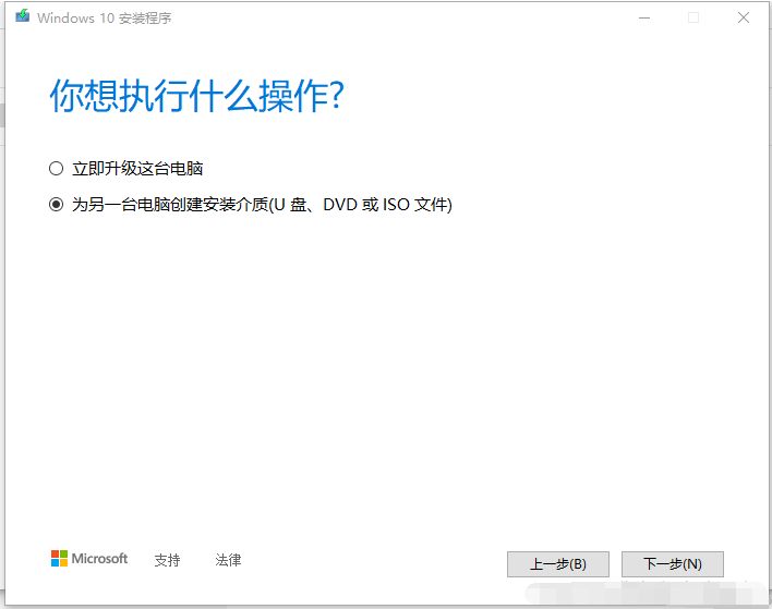 3、接受協議進入下一步,選擇第二項為另一臺電腦創建安裝介質。