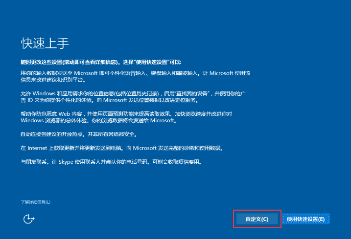 8、重啟后會進入“快速上手”設置界面,選擇“自定義”選項。