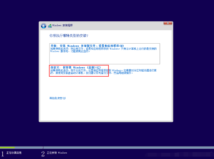 4、接受許可條款進入下一步,點擊“自定義”選項。